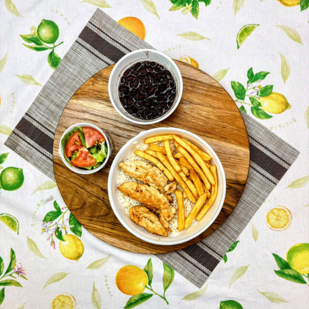 Arroz branco soltinho, Feijão (a sua escolha), Batatas Fritas, Frango Grelhado na Chapa + Salada do Dia !!