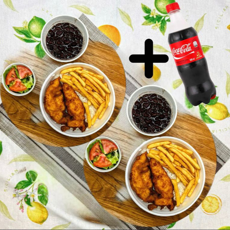 Arroz Branco Soltinho, feijão ( sua escolha ), Batatas Fritas, Frango Milanesa Crocante + Salada do Dia e uma Coca-Cola 600ml