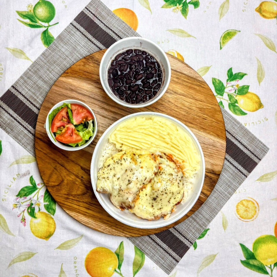 Arroz Branco soltinho, Feijão (a sua escolha), Batata Fritas e Frango à Milanesa Crocante, com o molho especial da casa e finalizado com mussarela derretida por cima !! + Salada do Dia cortesia da casa
