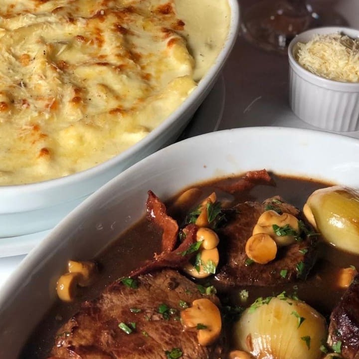 Acompanha: Arroz Branco e Purê de batata (porção maior)