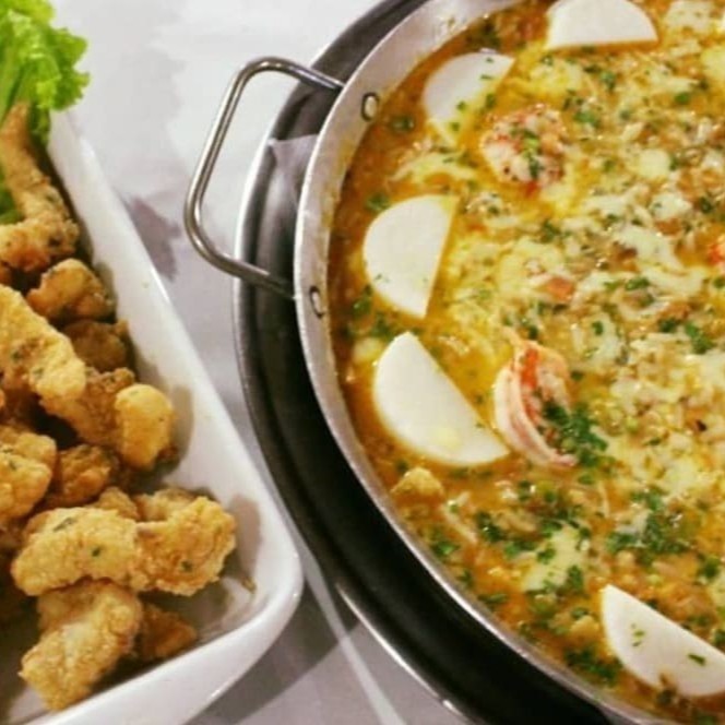 Risoto de camarão com palmito pupunha, ervilhas e especiarias gratinado. Servido com iscas de peixe frito.