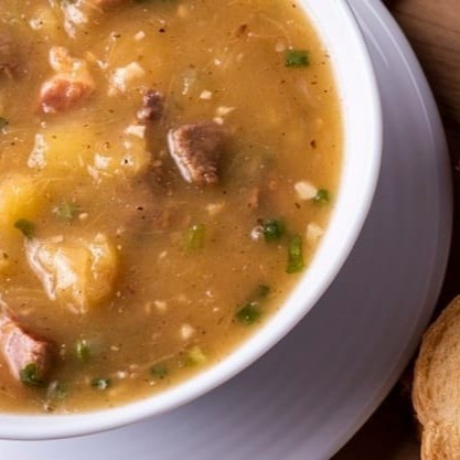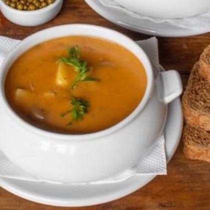 Sopa eslava (batata cozida, carne bovina e creme de leite) + acompanhamentos (biscuit e torradas da casa, salsinha fresca e queijo ralado)