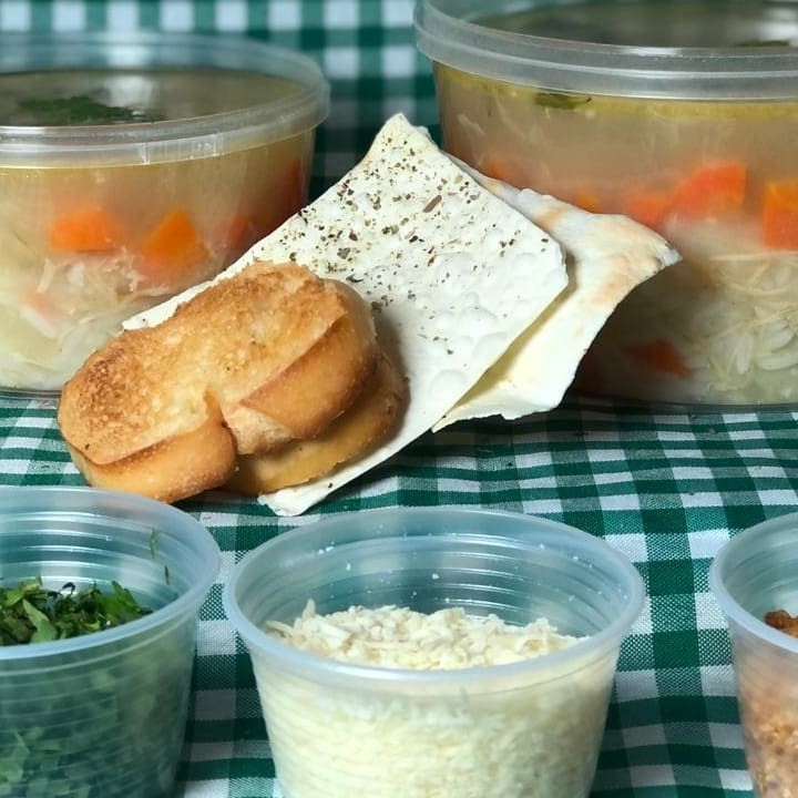 Capeletti in brodo (massa capeletti com peito de frango desfiado) + acompanhamentos (biscuit e torradas da casa, salsinha fresca e queijo ralado)