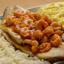 Filé de robalo levemente passado na farinha de arroz, frito em óleo de algodão. Camarões no azeite de oliva, com molho vermelho e um toque de amor. Acompanha um cremosissimo purê de batata e arroz branco