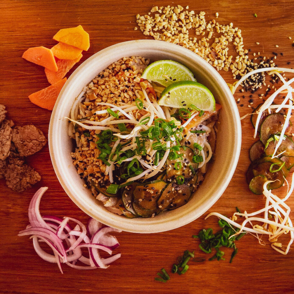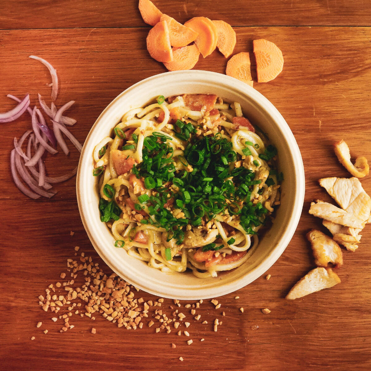Massa udon, pasta de amendoim, leite de coco, frango, cenoura e cebola roxa. Raízes orientais com uma explosão de sabores com a assinatura da Banca!