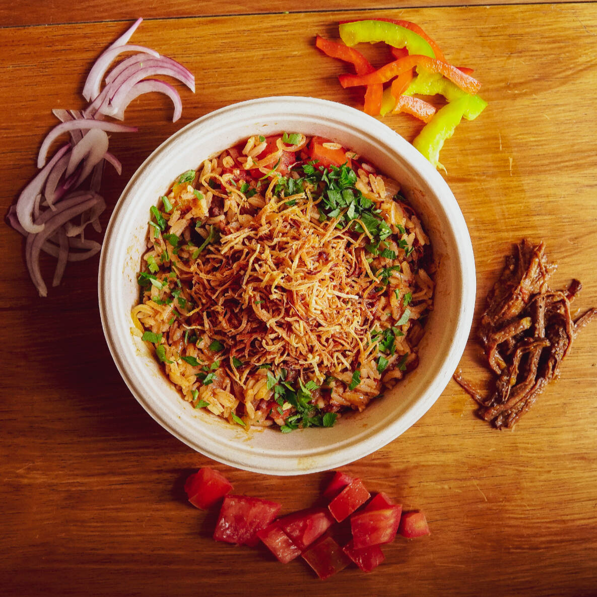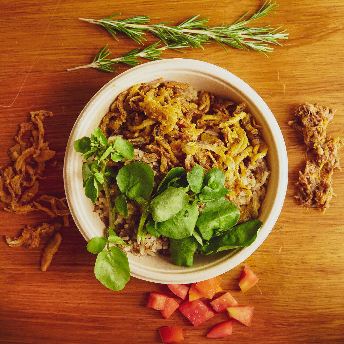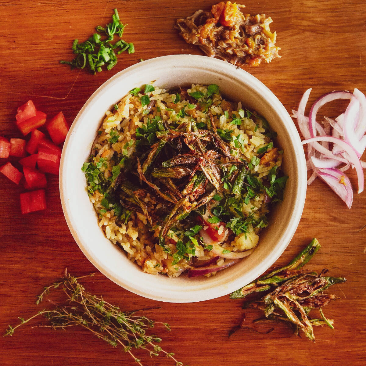 Arroz branco, fraldinha desfiada, tomate, pimentão, cebola roxa e páprica defumada. Finalizada com chips de batata doce.