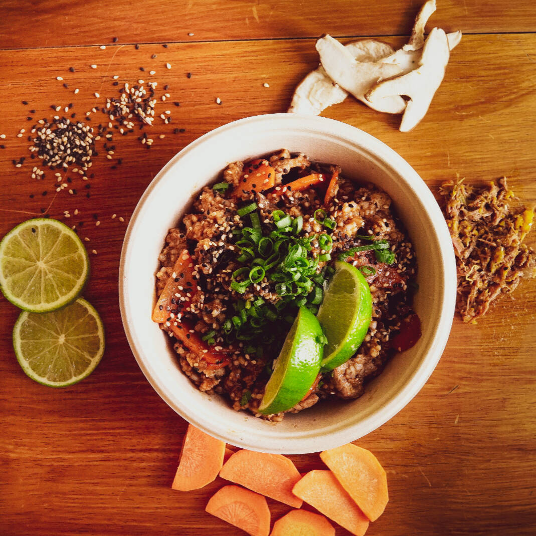 Arroz branco, paleta suína desifada, cenoura, shitake, cebola roxa com molho shoyu. Finalizada com couve crispy.