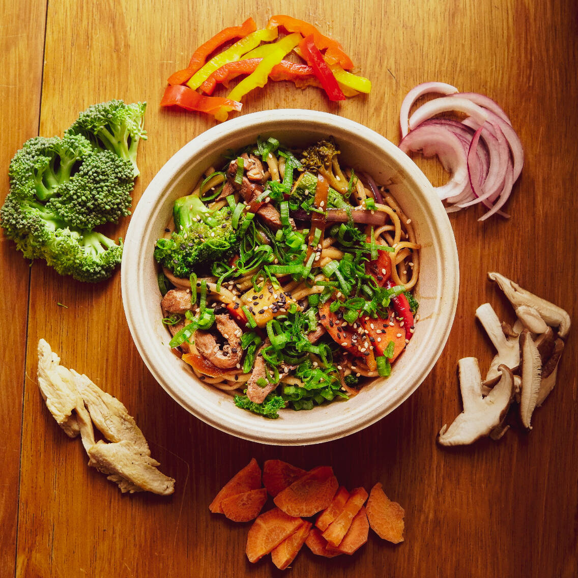 Feito com macarrão salteado na Wok, com frango, legumes frescos (cenoura, brócolis, abobrinha e shitake), pimentão, cebola roxa e um molho especial a base de shoyu, óleo de gergelim e outros temperos.