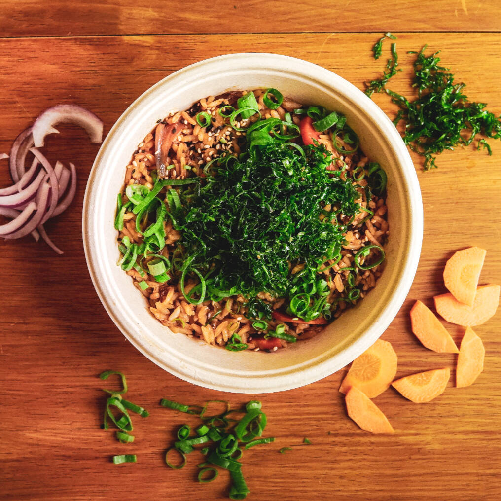 Arroz frito e temperado, com carne de porco, cenoura, pimentão e shitake. Leva ovo, alho e gengibre, finalizado com cebolinha e coentro