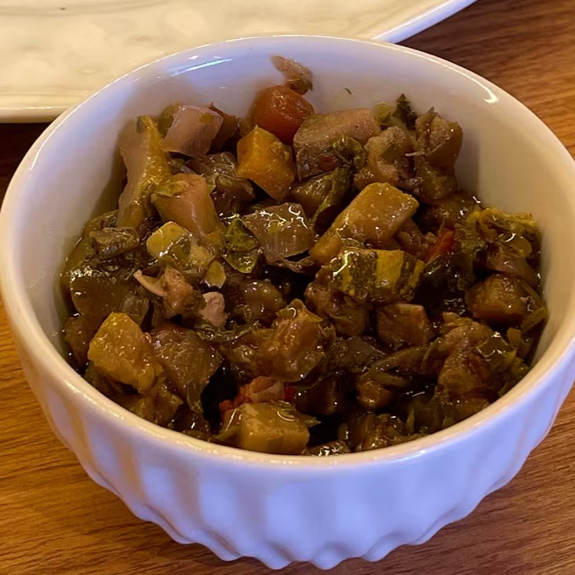 Berinjela, abobrinha, pimentão e azeitonas regados em azeite e especiarias. Acompanha pão sírio.