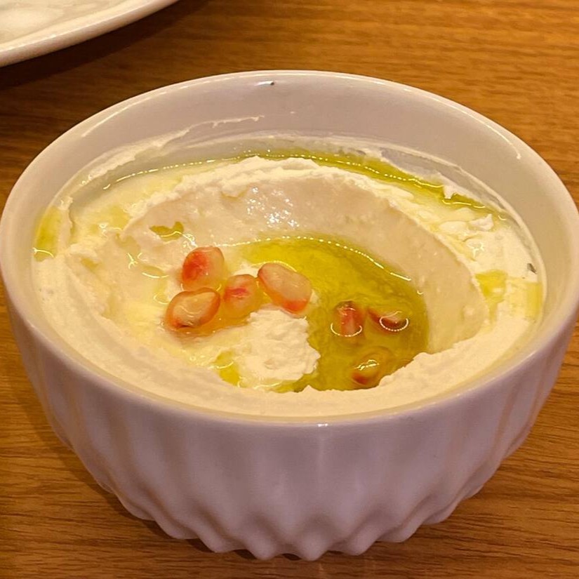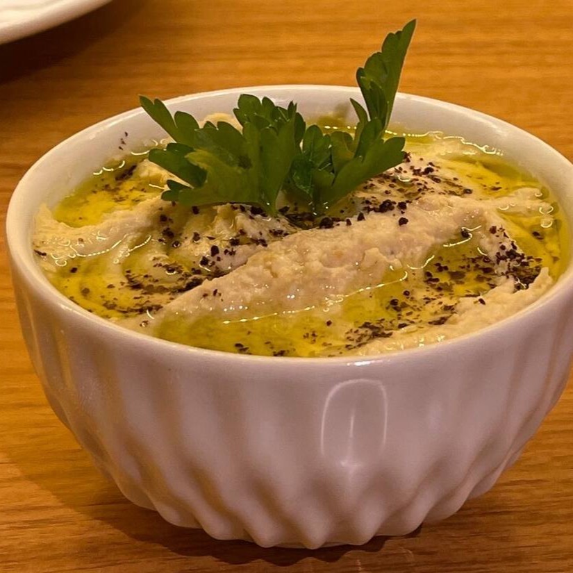 Grão-de-bico com especiarias e tahine. Acompanha pão sírio.