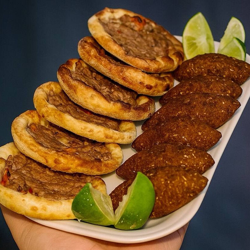 Mini esfiha de carne (6 unidades) e mini kibe (6 unidades).