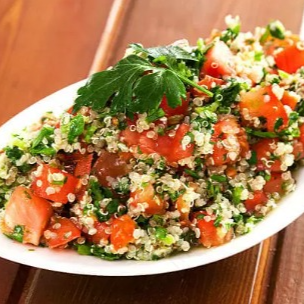 Trigo de kibe, cebola, tomate, pepino e salsinha. Acompanha pão sírio.