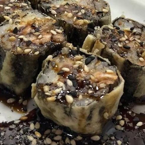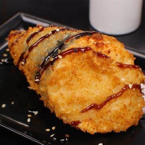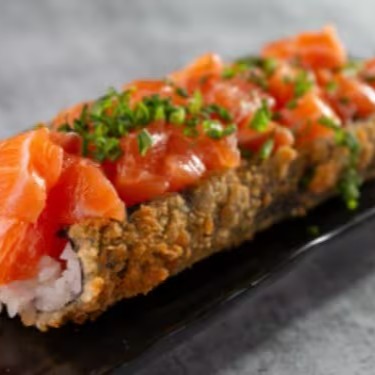 Sushi de arroz, salmão e cream cheese empanado e frito. Acompanha molho tarê e gergelim .