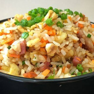 Porção de arroz japonês na chapa com bacon, ovo e cenoura. A cebolinha é opcional, caso queira favor colocar nas observações! Em torno de 400grs.