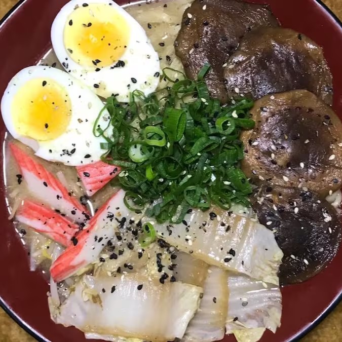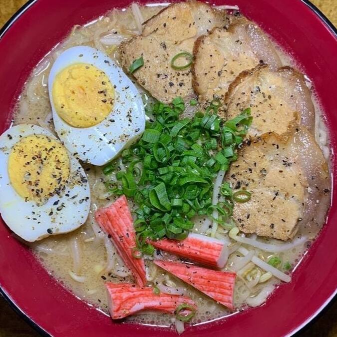 Caldo á base de missô , macarrão feito na casa, chasu( carne de porco cozida ) ovo cozido, moyashi (broto de feijão ) kani kama e cebolinha .