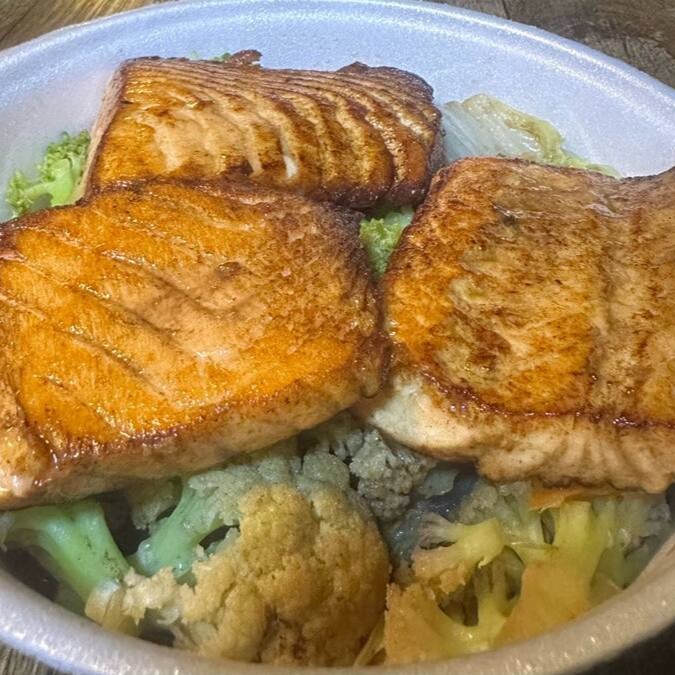 250gr de filé de salmão, acompanhado de legumes (brócolis, couve-flor, cenoura, cebola e acelga ) salteado no shoyu e na manteiga .