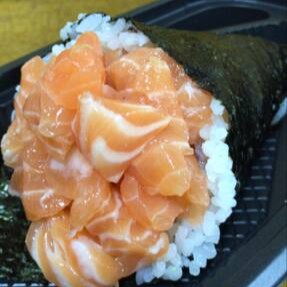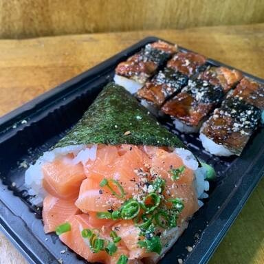 Cone de arroz e salmão.