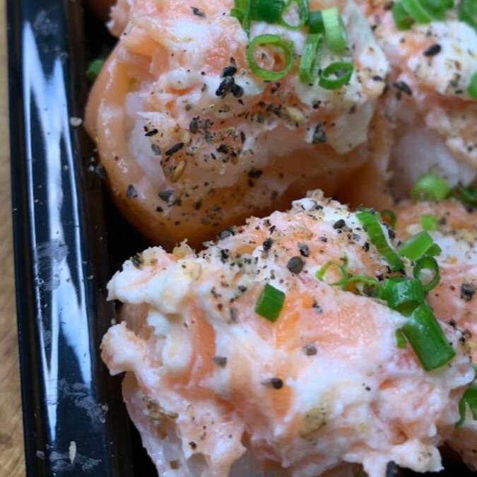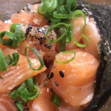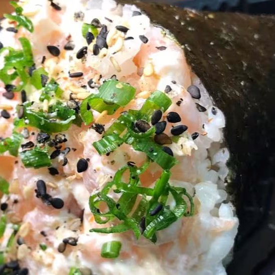 Bolinha de arroz, coberta com salmão, cream cheese, gergelim e cebolinha.