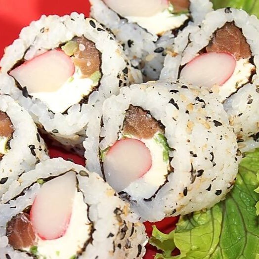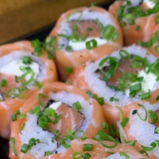Sushi de arroz e cream cheese enrolado em uma alga inteira, recheado com salmão fresco, gergelim e cebolinha.