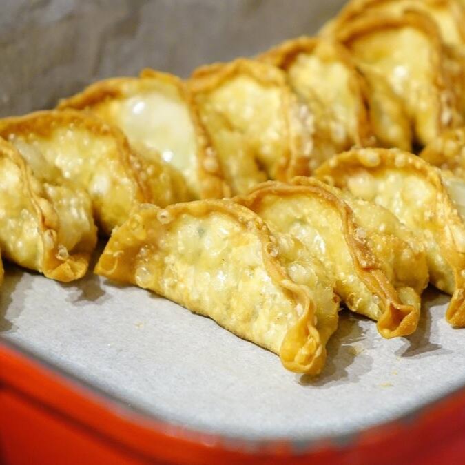 Porção de pasteizinhos recheados de carne com temperos orientais.