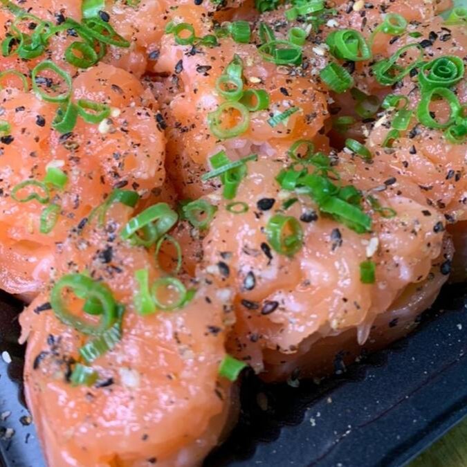Bolinha de arroz, coberta de salmão com gergelim e cebolinha.