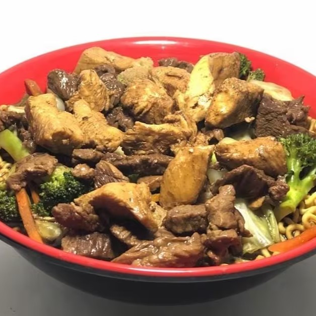 Macarrão, legumes (brócolis, couve-flor, cenoura e repolho ) tiras de carne e cubos de frango .