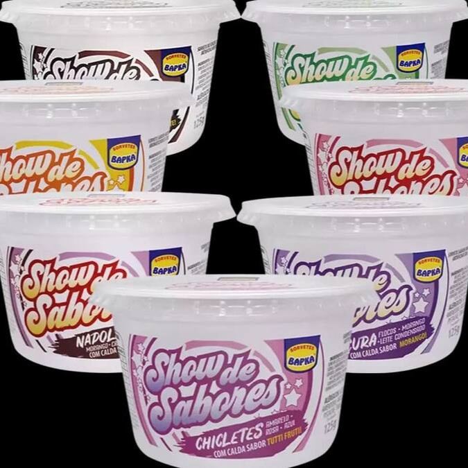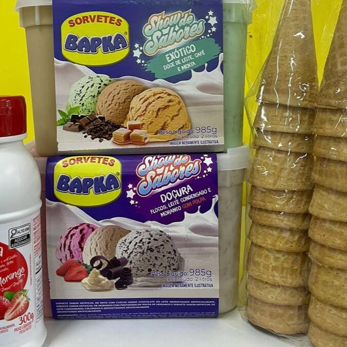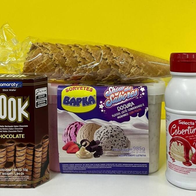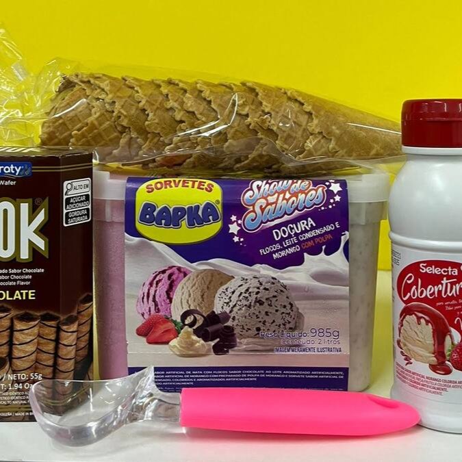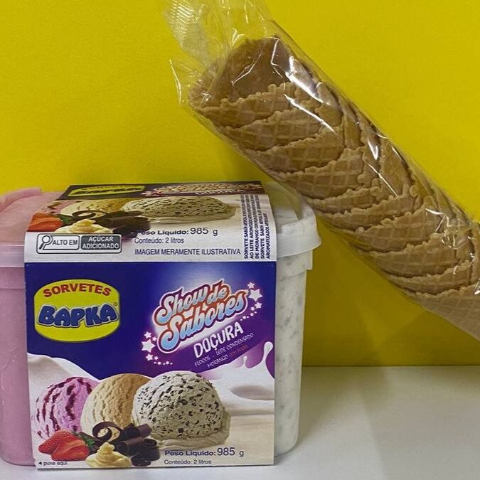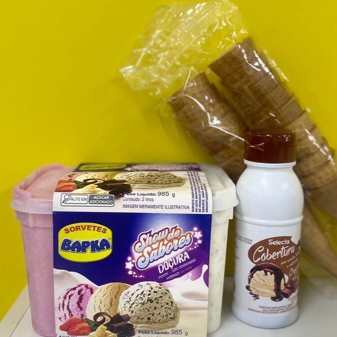 Dois potes de 2 litros (985g) + Uma cobertura 300g + Uma casquinha biscoito crocante 20 unidades.