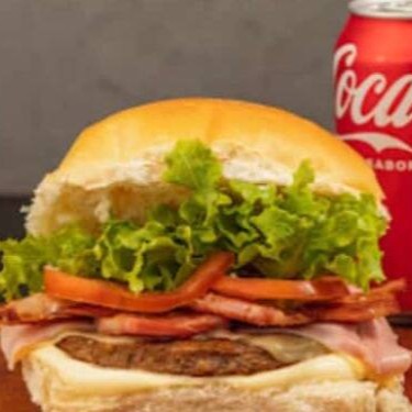 Pão, hambúrguer, maionese, queijo, presunto, bacon, alface e tomate!