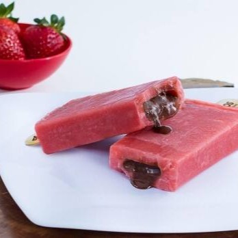 Paleta sabor morango recheado com creme de avelã.