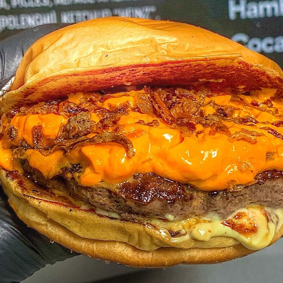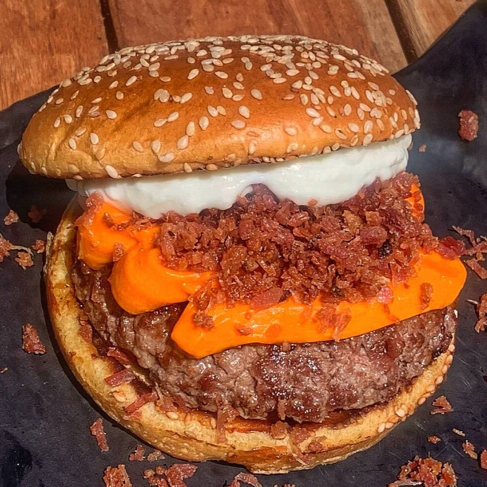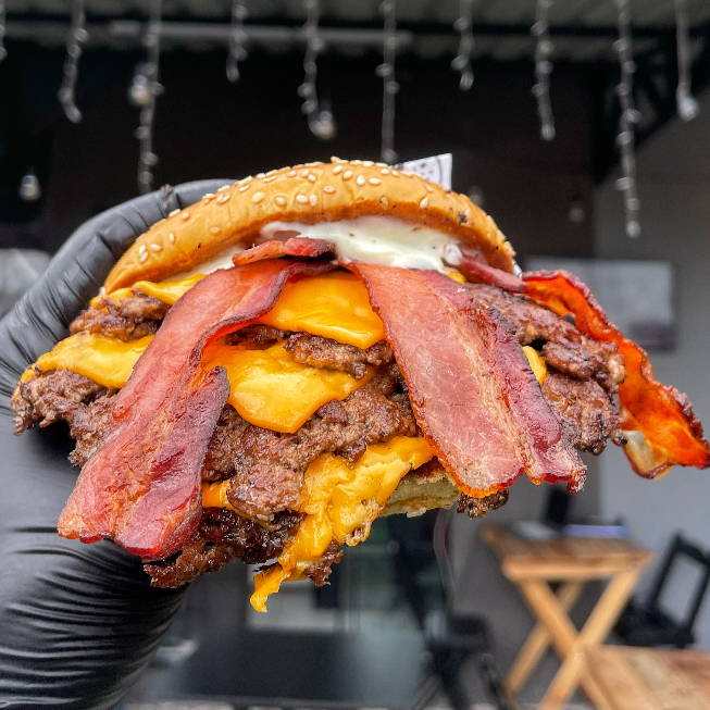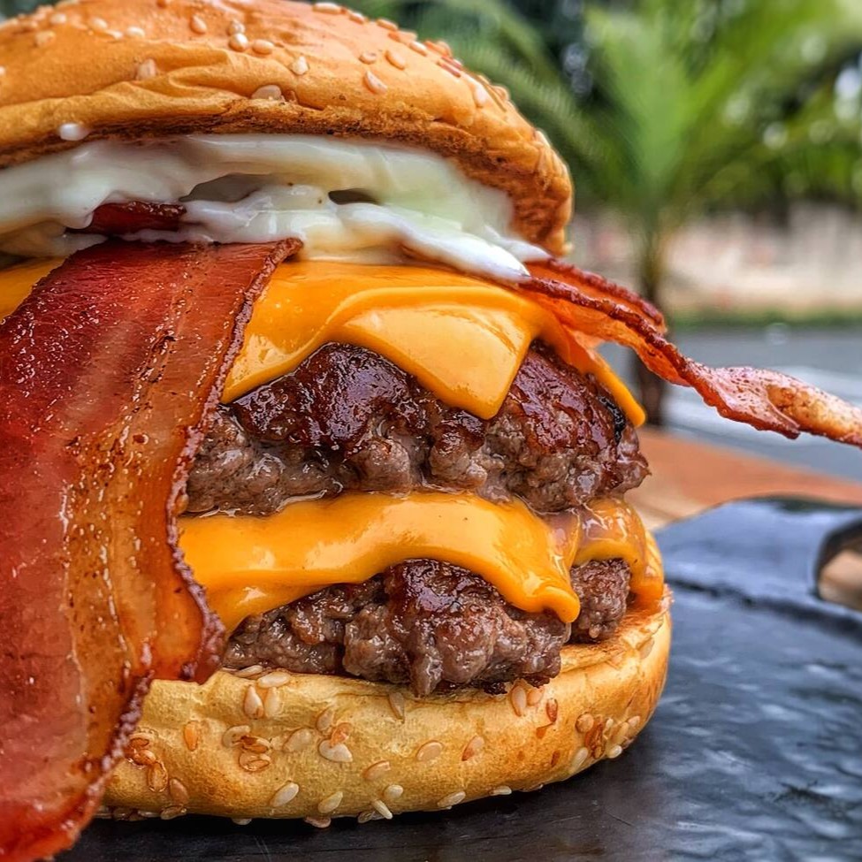 "3 Smash Burger de (80g) + Fatias de Cheddar Derretendo + fatias De bacon Crocante + Maionese nobre do Barão, tudo no pãozinho de brioche selado na chapa. "" diga gostosura 3x"" :)"
