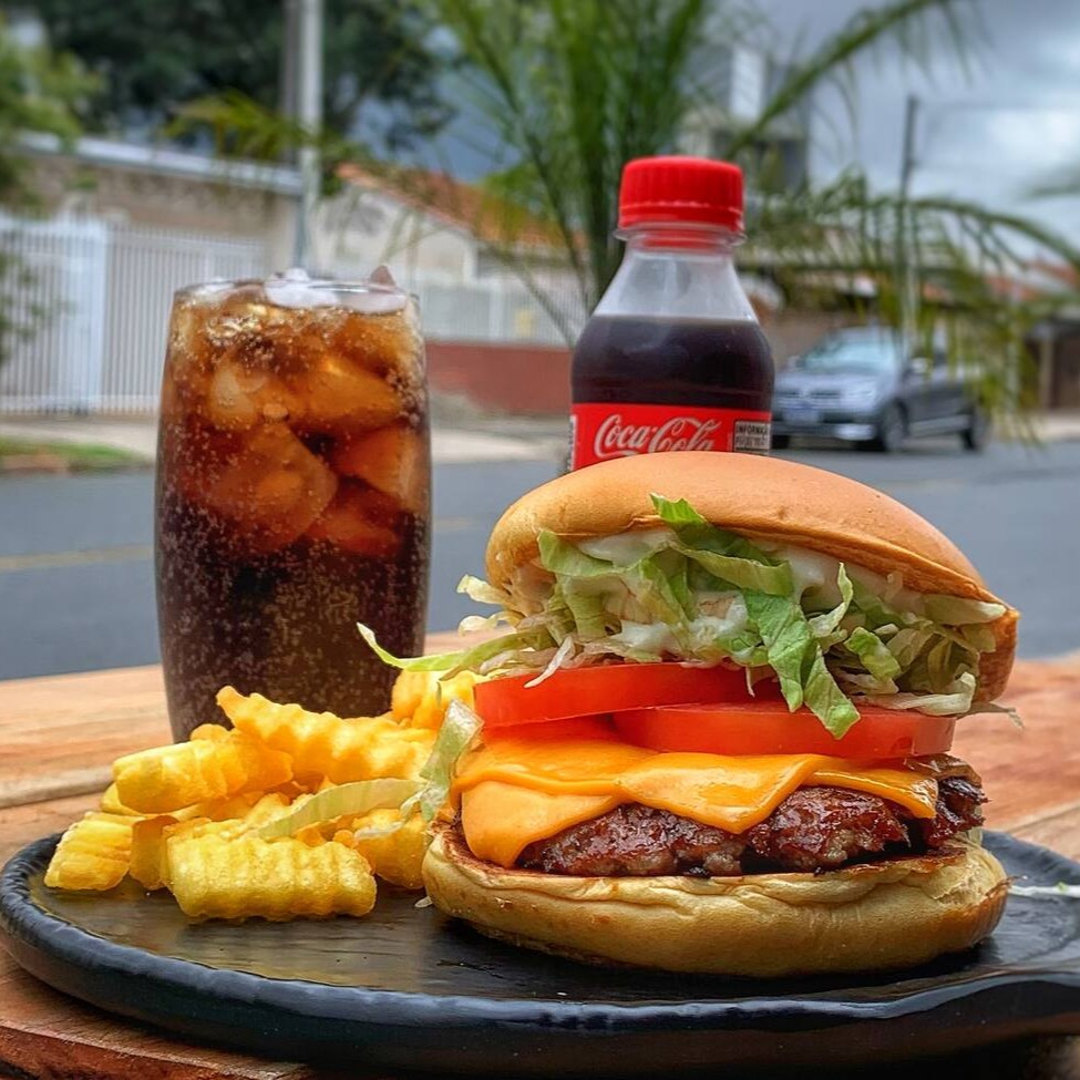 Hamburger de 80g (Smash) + Fatias de Cheddar Derretendo + Tomate Fresquinho + alface americana picadinha + Maionese nobre do Barão. + Batatinha douradinha (150g) + coca cola 220ml Geladinha.