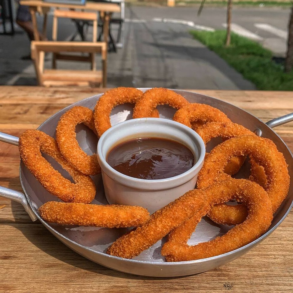 Hamburguer Suculento de 130g + fatias de Cheddar Cremoso + anéis de Cebola empanada + Molho Barbecue + Maionese nobre do Barão, tudo em um pãozinho de brioche selado na chapa. ''Anéis dourados, empanados e fritos!'' :)
