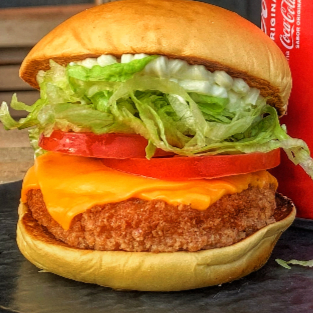 Hamburger de frango 100g (Empanado e frito) + fatias de cheddar cremoso + maionese nobre do barão + alface americana cortadinha + tomate fresquinho no pãozinho de Brioche Selado na Chapa. Simples e apaixonante :)