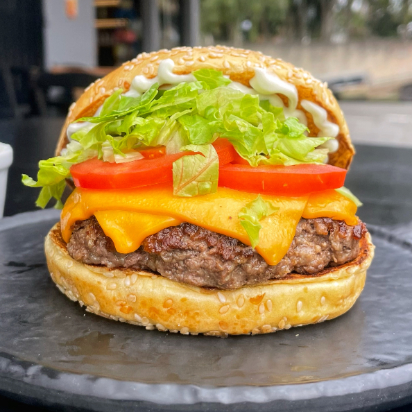 Hamburger de 80g (Smash) + fatias de Cheddar Derretendo + Alface americana cortadinha + Tomate fresquinho + Picles artesanal + maionese nobre do Barão, Tudo em um Pãozinho de Brioche Selado na chapa.