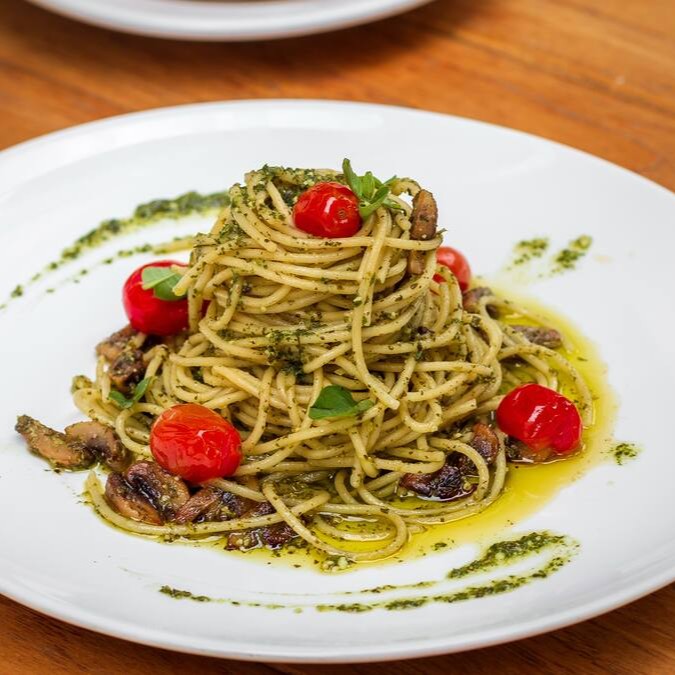 Spaghetti ao molho pesto Barbarella, cogumelos salteados e tomate confi. Acompanha o nosso premiado pão francês, para deixar a sua refeição ainda mais incrível!