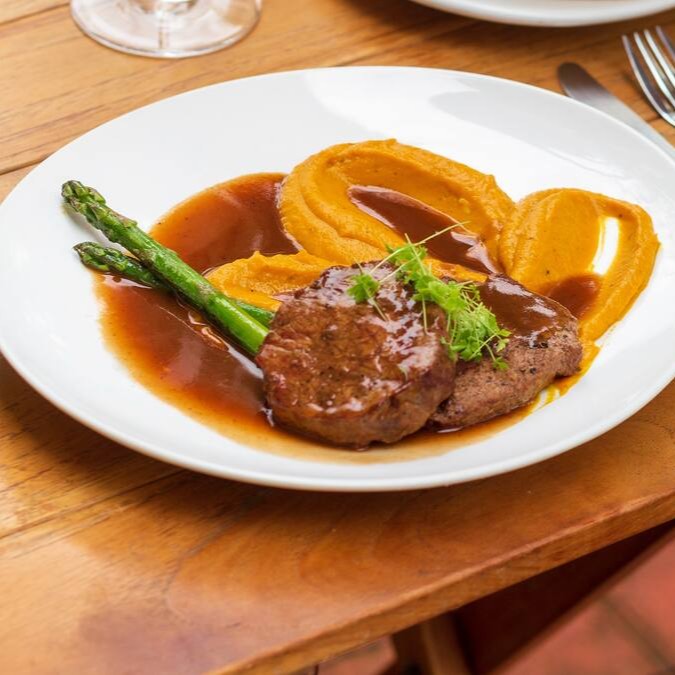 Steak de Mignon au Demi-Glace com Pure aromatico de Cabotiá. Aspargos tostados e Amolicado crocante. Acompanha o nosso premiado pão francês, para deixar a sua refeição ainda mais incrível!