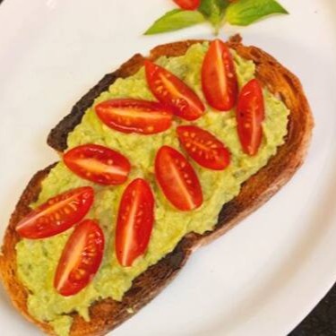 O Avocado Toast é vem em uma Torrada do saboroso Pain Au Levain, com avocado amassado e temperado com nosso molho de limão siciliano e pedaços de tomate cereja no topo.