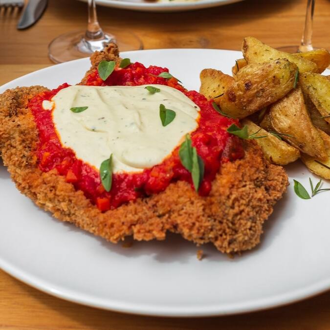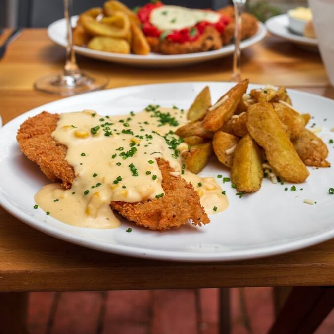Alla Milanese ultra crocante de carne, coberta com molho sugo artesanal, um toque de fonduta de gorgonzola e alecrim, acompanhado de batatas wedges. Acompanha o nosso premiado pão francês, para deixar a sua refeição ainda mais incrível!