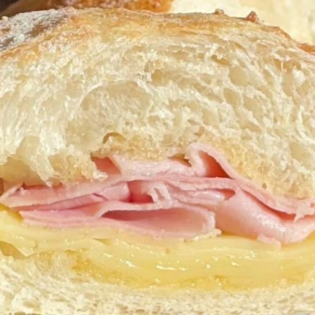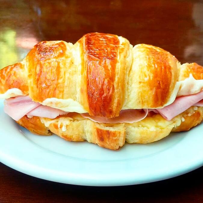 Croissant, presunto, queijos gruyère e mozzarella gratinados.