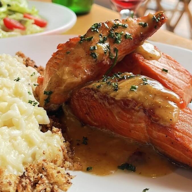 Tranche de salmão ao molho cítrico guarnecido de risoto de Brie au citron e amolicado crocante. Acompanha o nosso premiado pão francês, para deixar a sua refeição ainda mais incrível!