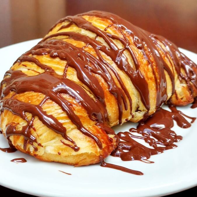 Pão folhado em formato de quarto crescente recheado e coberto com chocolate meio amargo derretido.