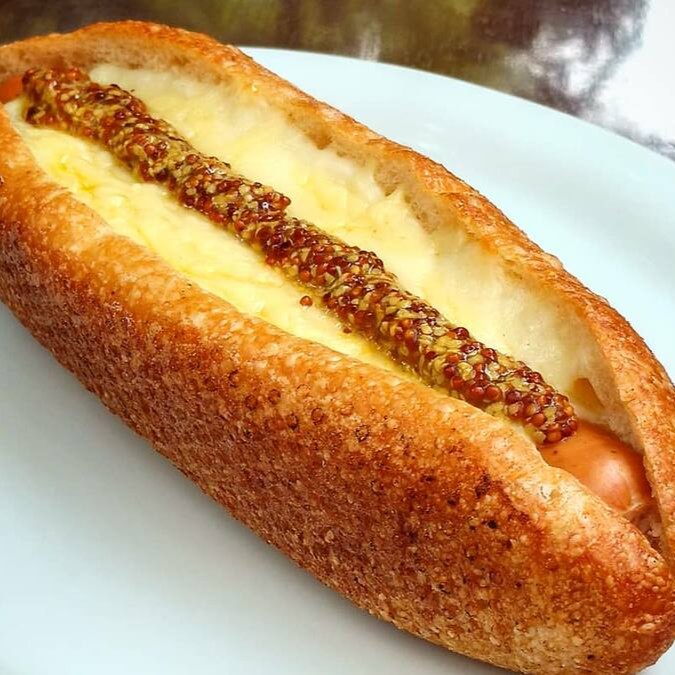 Baguetinha tradicional, salsicha longa tipo frankfurt, gratin de queijo mozzarella e parmesão com um toque de mostarda à l’ancienne.