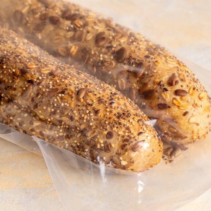 Direto do nosso forno para o seu: você termina de assar em casa! Nossa receita Original, pré assada, livre de conservantes e aditivos, conservada a vácuo em atm controlada - Baguetinha de 23 cm feita com farinha integral e 7 grãos. Pacote com 2 unidades de 100g cada.