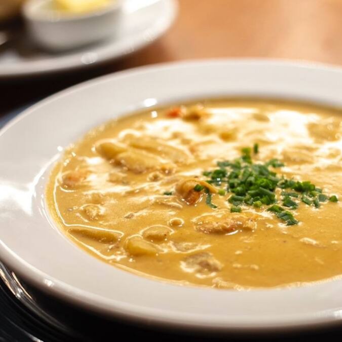 Com um caldo rico a base de leite, o Chowder de Camarão ainda vai acompanhado de nosso pão francês.