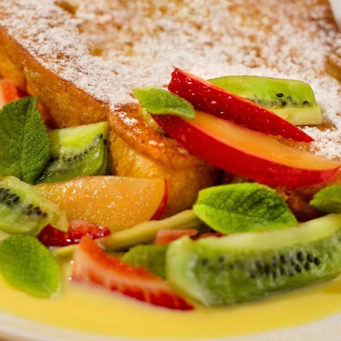 A clássica French Toast em sua versão com nosso delicioso e afetivo Pão de Aipim. Acompanha Crème Anglaise e frutas laminadas.