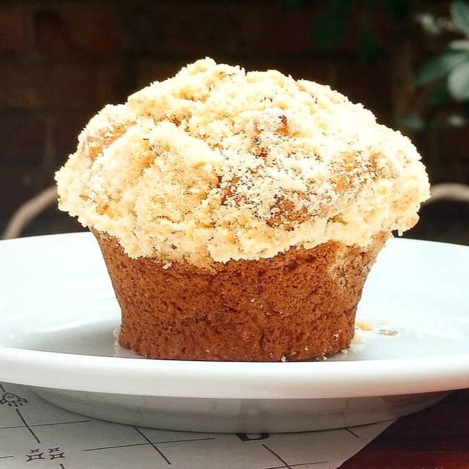 Homemade muffin style: com cubos de maçã, canela e streusel crocante no topo.
