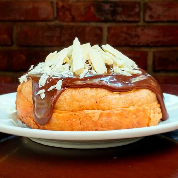 Clássico pão dinamarquês coberto com brigadeiro e chocolate branco.