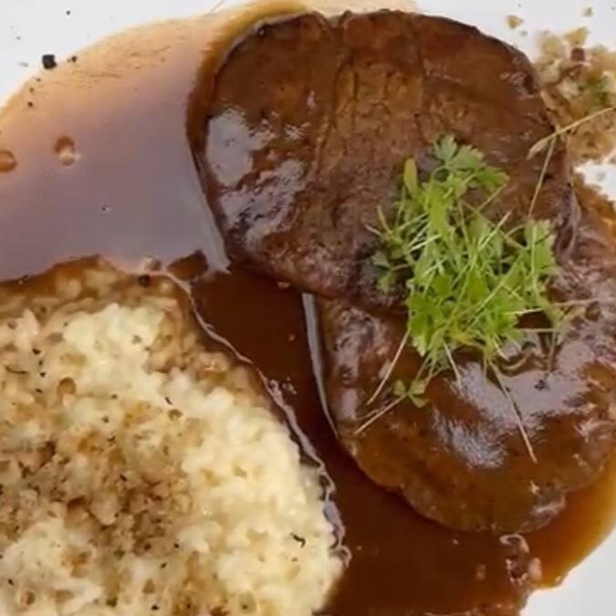 Steak Mignon ao Demi-Glace com Risoto de Brie e Amolicado Crocante. Acompanha o nosso premiado pão francês, para deixar a sua refeição ainda mais incrível!