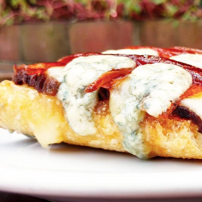 Baguette tradicional aberta, queijo mozzarella gratinado, rosbife de filé, cebolas carameladas e queijo gorgozola.